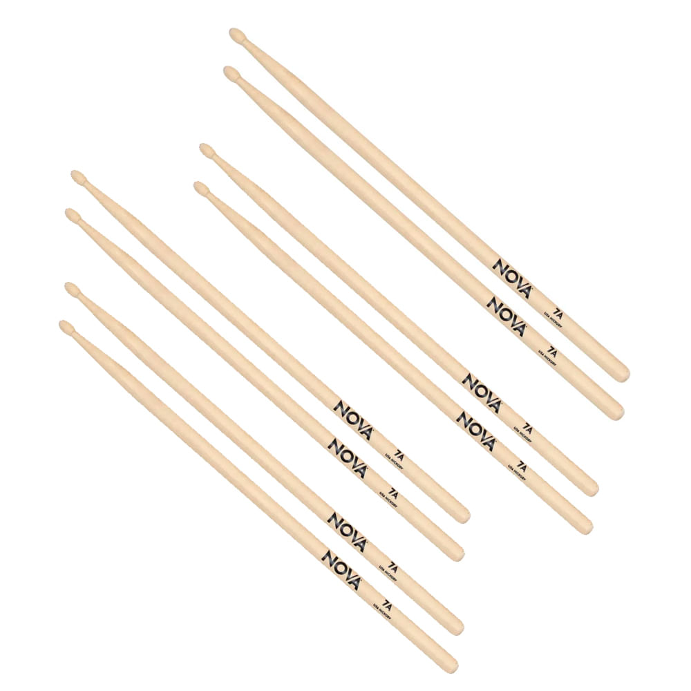 A marca NOVA é a linha econômica da Vic Firth, possui os tamanhos tradicionais da marca, com ponta em formato de Gota nos modelos Nylon e madeira.